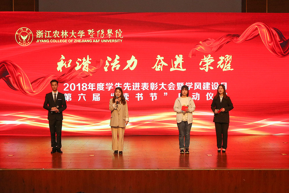 4月22日晚,浙江农林大学暨阳学院2018年度学生先进表彰大会暨学风建设月、第六届“读书节”启动仪式在学院明珠报告厅举行。必赢76net线路官网党政班子成员,诸暨团市委副书记何威出席活动。学院全体中层干部、辅导员和学生代表参加活动。