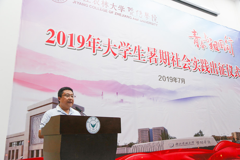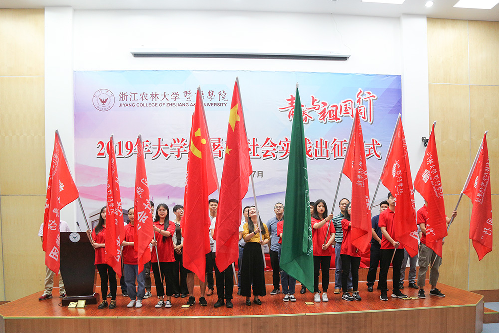 仪式上,学工部负责人宣读了2019年暑期社会实践立项团队名单,相关负责人强调了暑期社会实践安全等注意事项。与会领导为各团队授旗,实践团指导教师代表、学生代表分别做了表态发言。