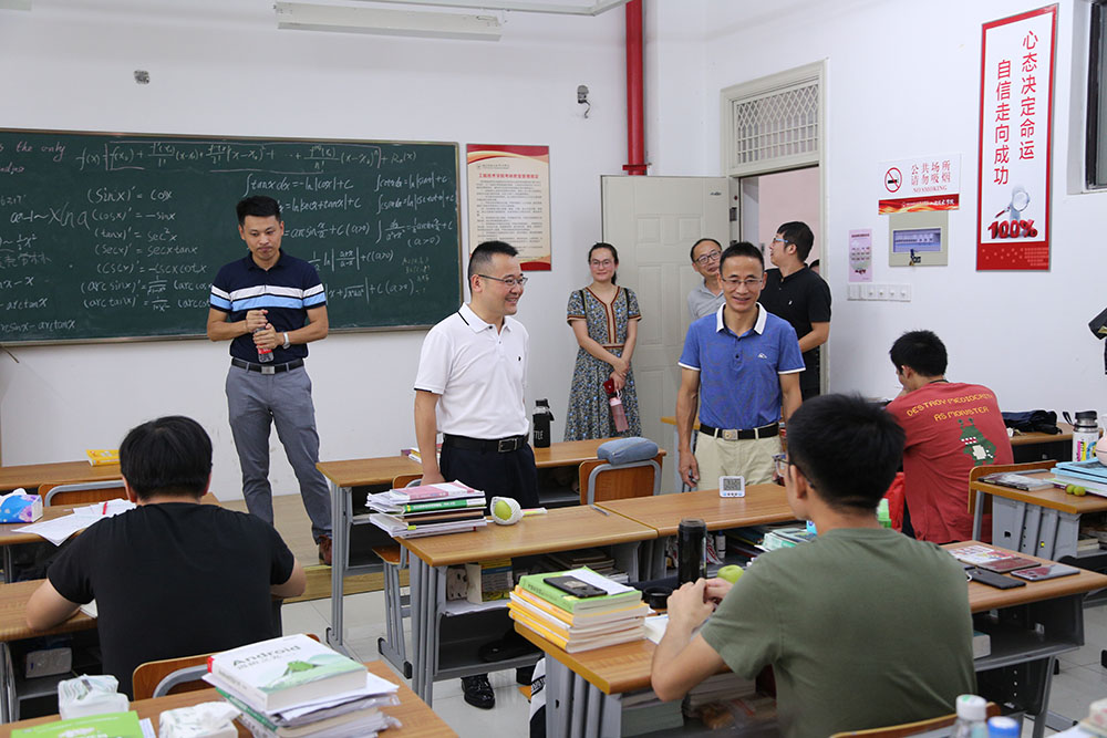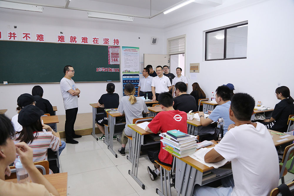 在教学楼考研教室,院领导与考研学生亲切交谈,关切询问了考研学子的复习进度,以及学生们近期的思想动态和身体状况。勉励考研学子坚持不懈,充分利用宝贵的暑期时间打好复习攻坚战,实现考研梦想。