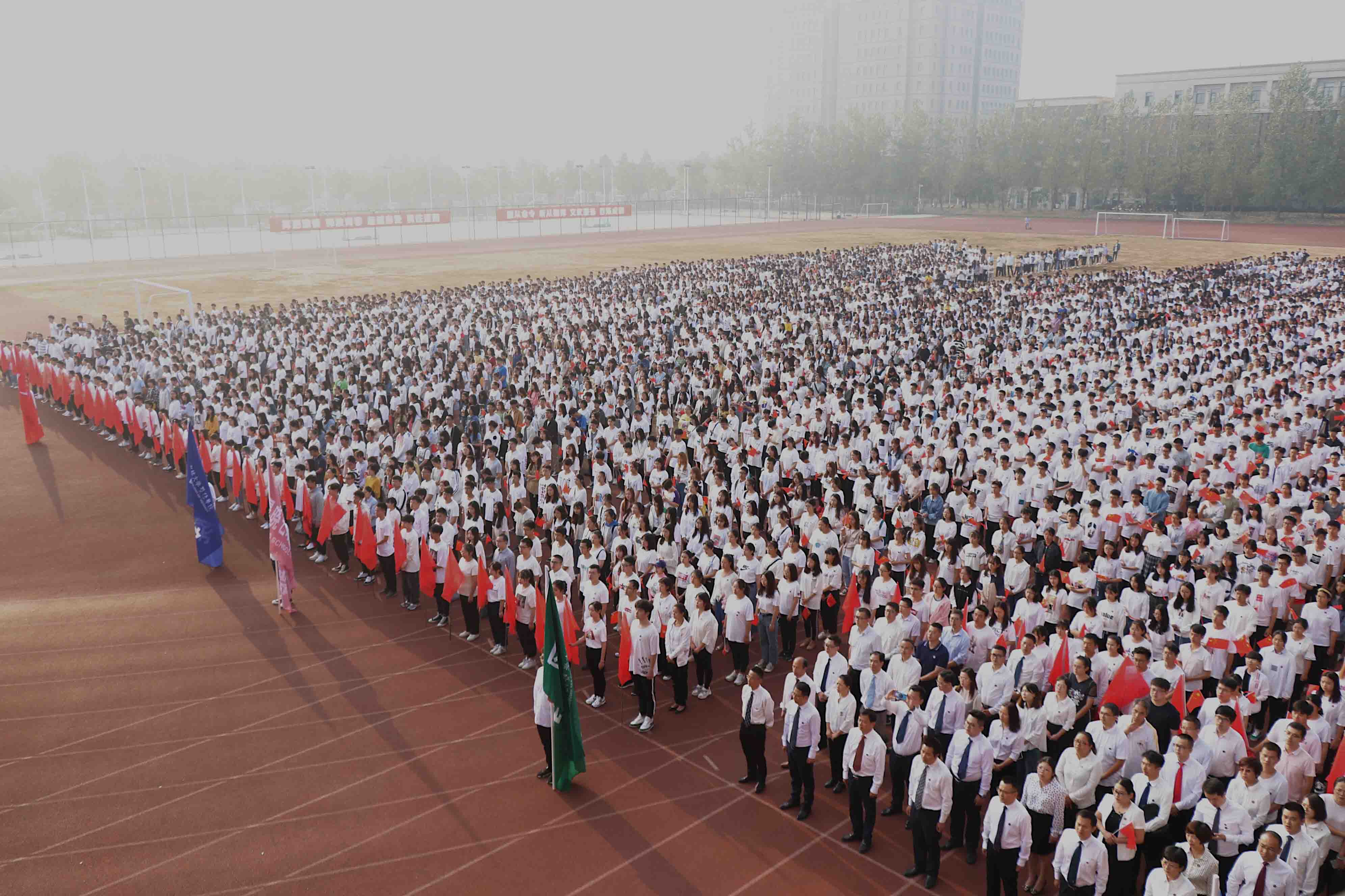 “五星红旗迎风飘扬,胜利歌声多么嘹亮,歌唱我们亲爱的祖国,从今走向繁荣富强……”在场全体师生身着正装、整齐列队、激情澎湃、齐声高歌《歌唱祖国》,5000余面小国旗在师生们手中挥舞,舞出的是心中无限的赤诚与热望,表达了对伟大祖国的衷心爱戴和真诚歌颂。