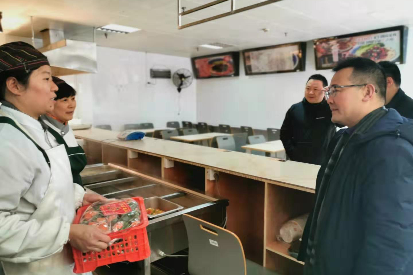 在学院假期集中用餐的食堂,潘国忠向值班人员详细询问了假期用餐情况,对新一年食堂管理工作提出了殷切希望,要求加大食品安全防控力度,确保食品安全;要做好饭菜及食品供应工作,及时发现消除安全隐患;要科学合理搭配膳食,加强餐厅环境卫生管理,注重食品安全,提供好优质的服务。