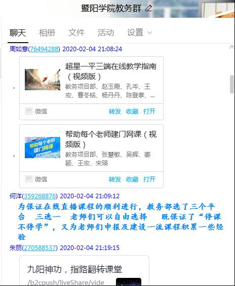 为保障线上教学的质量,帮助广大教师尽快掌握“互联网+教学”基本技能和要求,学院教务部安排专人负责线上教学安排及培训工作,汇总各类资源并及时在学院教务群中分享,建立平台培训群组织教师加入,协助平台客服人员为教师开展线上培训工作,对拟实施在线教学的教师进行指导,解答教师在使用平台过程中出现的问题,为教师快速熟悉掌握教学平台功能和教学工具的使用方法提供了保障。