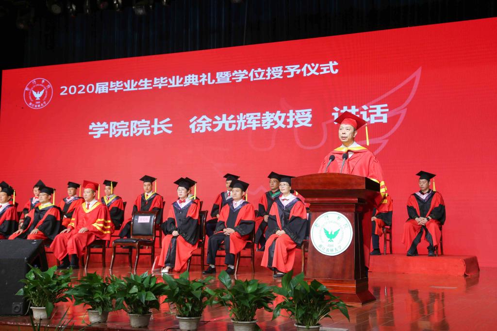 徐光辉勉励同学们要从这场疫情中得到思考和启发,人生的道路不会总是一帆风顺,前方充满了未知和挑战,要思考如何面对这百年未有之大变局,肩负起时代赋予我们的重任,实现自己的理想抱负和人生价值。他希望,一是要用爱国之心,坚定信念,共筑梦想。同学们即将离开象牙塔,正式迈入社会的大熔炉,要充分做好心理准备,牢记老师们的嘱托、学院的期盼,满怀爱国情怀,坚定理想信念,志存高远,脚踏实地,在实现中国梦的生动实践中放飞自己的青春梦想。二是要用拼搏之力,迎难而上,砥砺前行。同学们要有“主人翁”意识,在今后的工作岗位上继续发扬“坚韧不拔,不断超越”的农林精神,人人都当奋斗之人,人人都尽拼搏之力,凝聚成无坚不摧的青春力量,接好时代的接力棒,奋力拼搏,迎难而上,砥砺前行。三是用创新之火,点燃引擎,共创未来。同学们要牢记知识创造财富,科技成就未来,你们创新的一小步,就有可能是社会创新的一大步。进入社会后依然要不断学习,提升自我素养和能力,面对未知的世界,以创新驱动,激发干事创业的活力,敢于做先锋,不做过客、不当看客,让创新成为远航的动力,让创业成为搏击的能量,让未来焕发更绚丽的光彩。