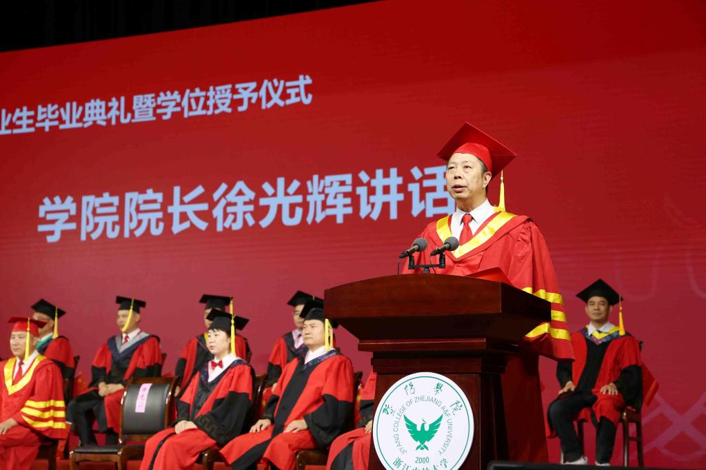 徐光辉作题为《星辰大海 征途在前》的讲话,代表学院全体教职员工向2021届毕业生圆满完成学业顺利毕业表示热烈祝贺,并深情回顾了四年来同学们的成长、进步、变化和学院发展取得的成绩。徐光辉在离别之际,为毕业生们送上了最真挚的祝福和最殷切的期盼。他希望,一是要坚定理想信念,与时代主题同心同向。要坚定理想信念,站稳人民立场,厚植家国情怀,投身强国伟业,同亿万人民一道,在实现中华民族伟大复兴中国梦的强国征程中奋勇搏击。二是要常怀感恩之心,锤炼高尚品德修为。要心怀感恩,常念父母的养育之恩、老师的教导之恩和亲友的知遇之恩,倍加珍惜与亲友、同事之间的缘分,以更加积极的心态面对生活,让未来不留遗憾。三是要不断创新实践,扛起时代新使命。要在时代浮沉浪潮里,敢为人先,将创新方法与创造性思维融入日常生活中,为社会带来更多的可能性,成为时代进步的推动者,勇敢肩负起新时代赋予的使命与责任。