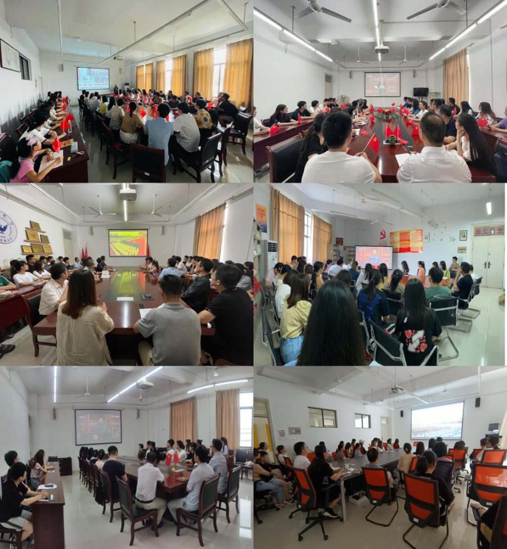 “五星红旗迎风飘扬,胜利歌声多么响亮……”会议室里,师生们跟着直播一起唱起了红歌,大家聚精会神聆听习近平总书记的讲话,师生们边听边记,让全体师生备受鼓舞,为生在华夏而无比自豪。