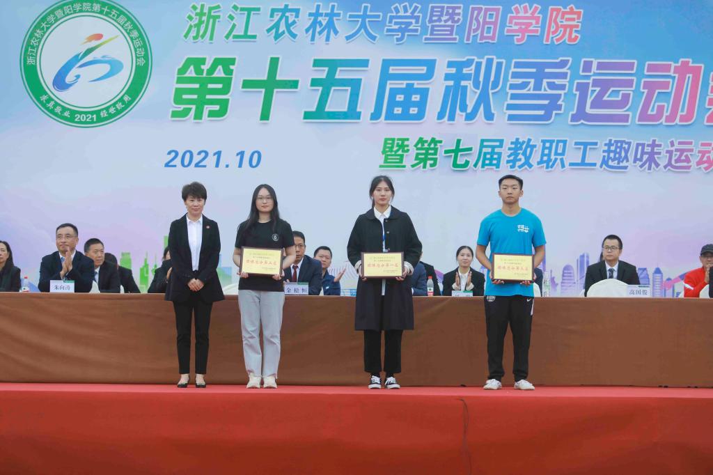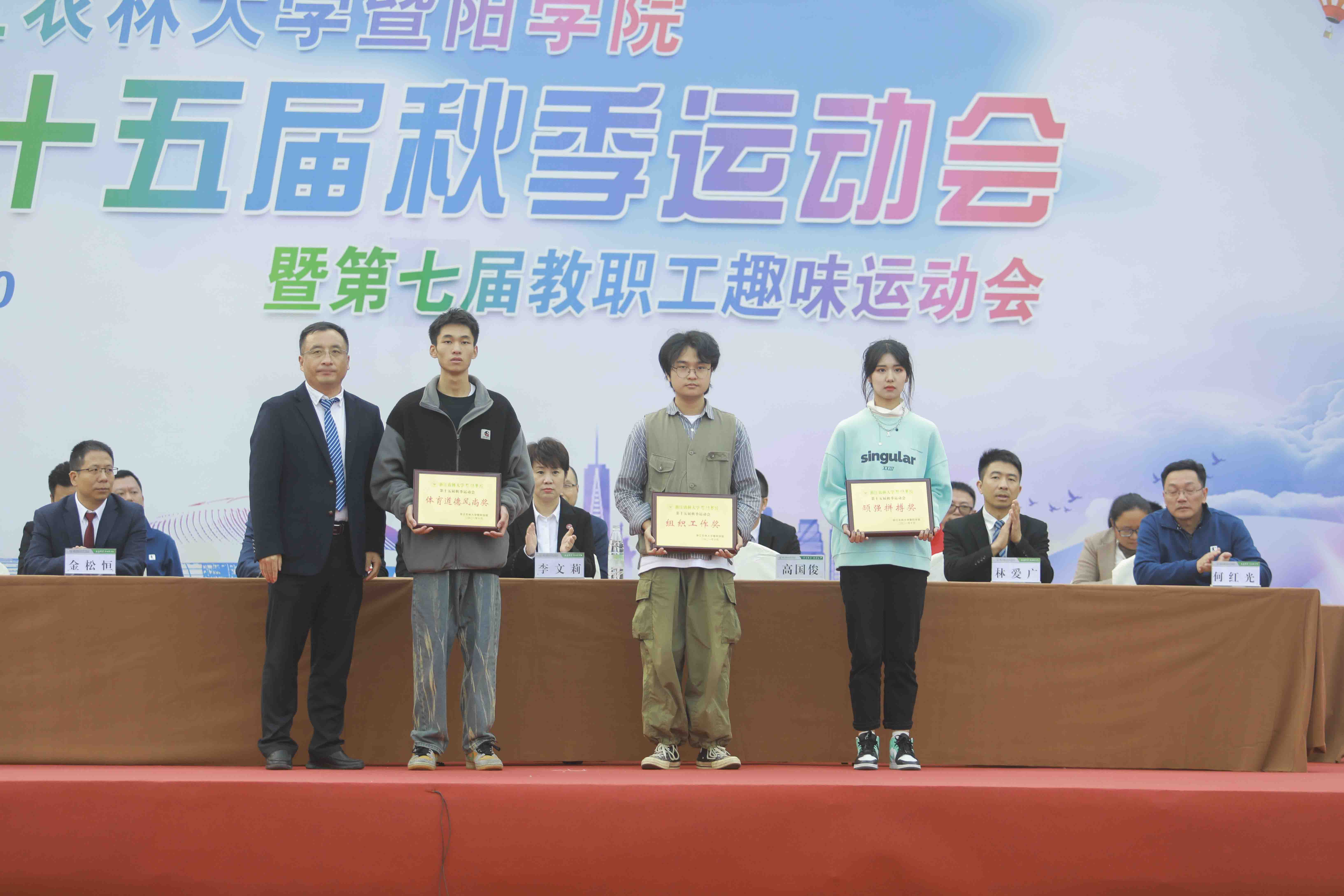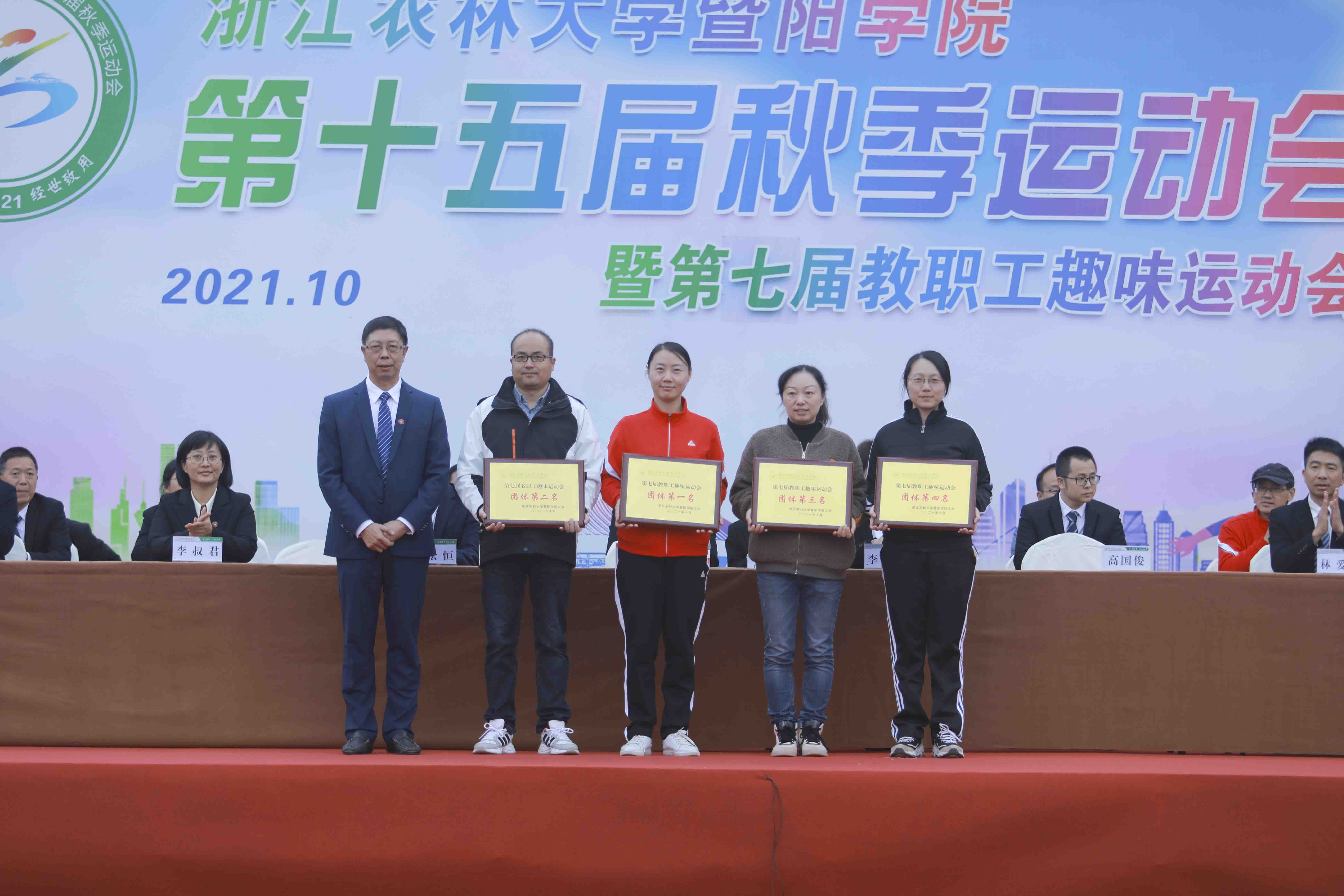 本届运动会共评选出叶金国等12名优秀运动员。生物环境学院、商学院、工程技术学院分别获得男女团体总分前三名;工程技术学院、生物环境学院、商学院分别获得男子团体总分前三名;园林学院、人文学院、商学院分别获得女子团体总分前三名;机关第二分工会、工程技术学院、机关第一分工会分别获得教职工趣味运动会团体前三名。
