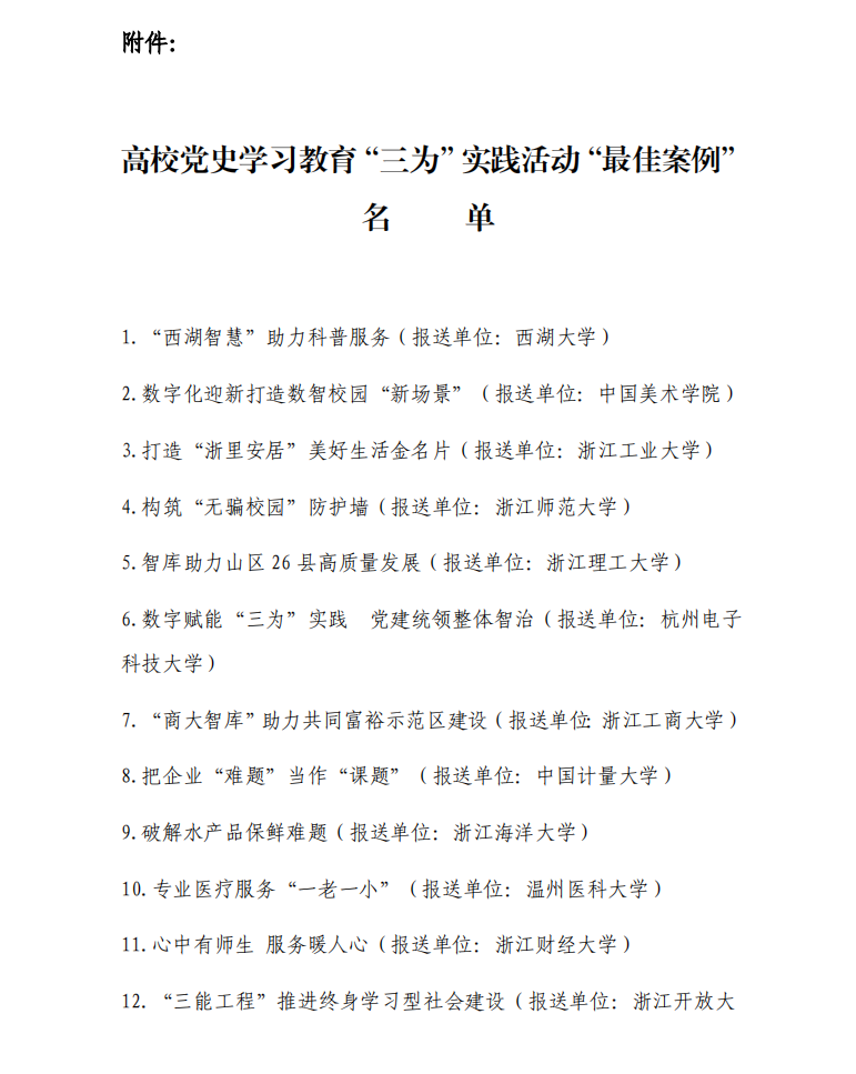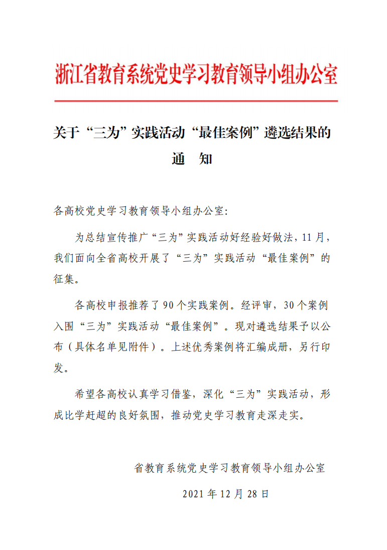 近日,浙江省高校党史学习教育“三为”实践活动“最佳案例”评选结果公布,必赢官网《智治平台激发“枫桥经验”新动能》案例在90个申请案例中脱颖而出,成功入选,是本次入选高校中唯一一所独立学院。