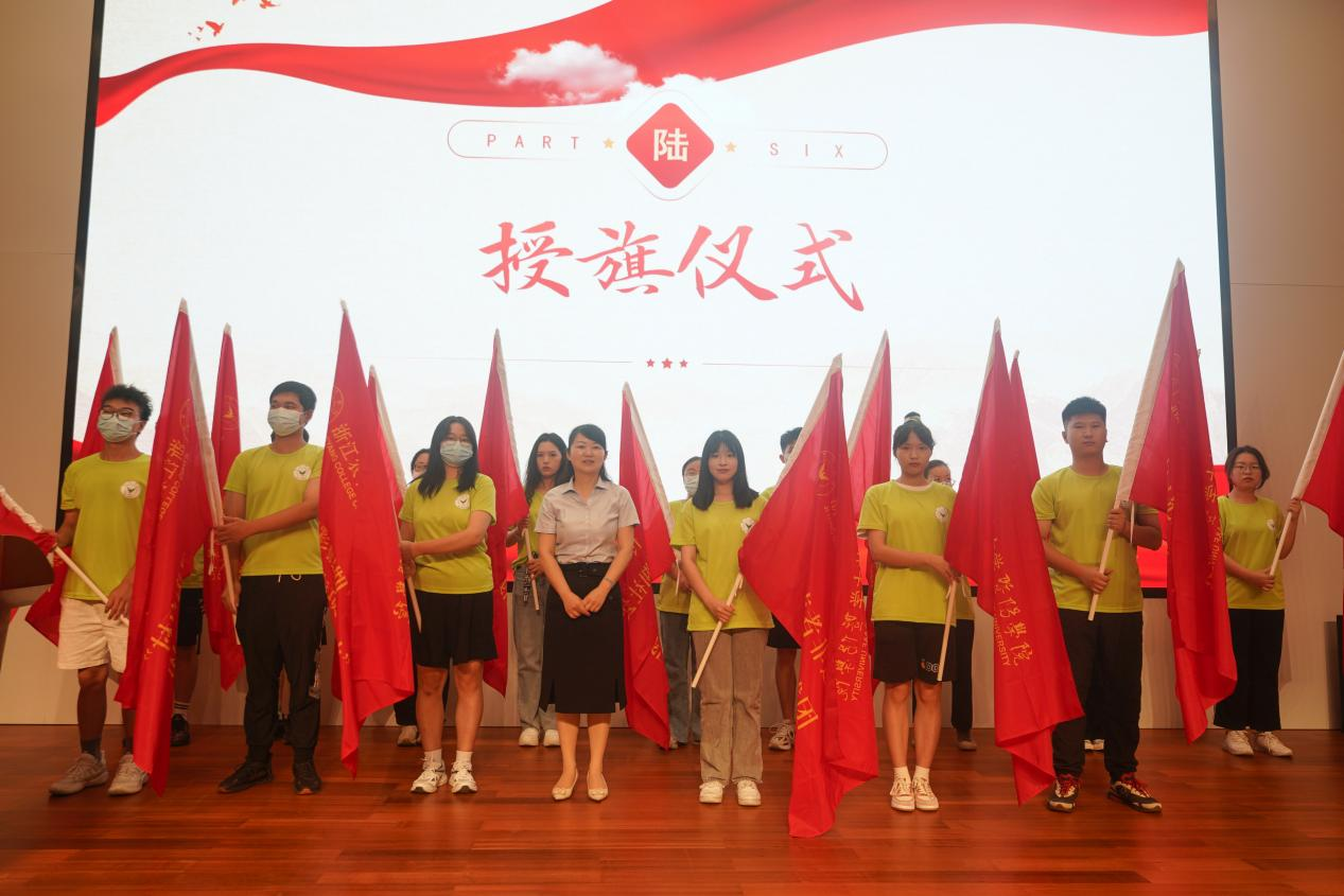 出征仪式上,洪昀为2022年必赢76net线路官网大学生暑期社会实践重点立项团队代表授旗。