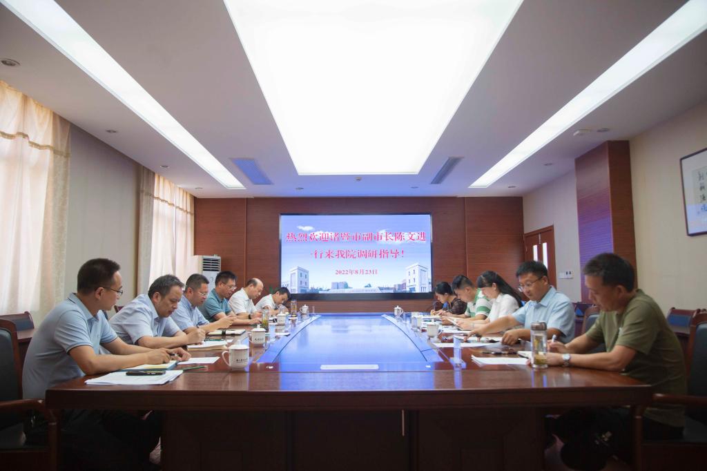 8月23日下午,诸暨市副市长陈文进一行来必赢官网调研指导。诸暨市教体局局长陈初明、副局长杨均力,人社局副局长应仲九陪同调研指导。学院党委书记洪昀、党委副书记高国俊参加座谈会。