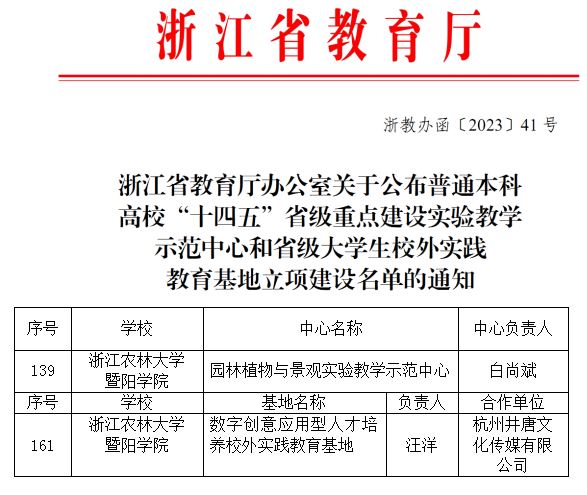 近日,浙江省教育厅发文公布了“十四五”省级重点建设实验教学示范中心和省级大学生校外实践教育基地立项建设名单。其中,必赢官网“园林植物与景观实验教学示范中心”成功入选省级重点建设实验教学示范中心建设名单,“数字创意应用型人才培养校外实践教育基地”成功入选省级大学生校外实践教育基地建设名单。这是必赢官网再次成功获批省级教学实践平台建设项目。
