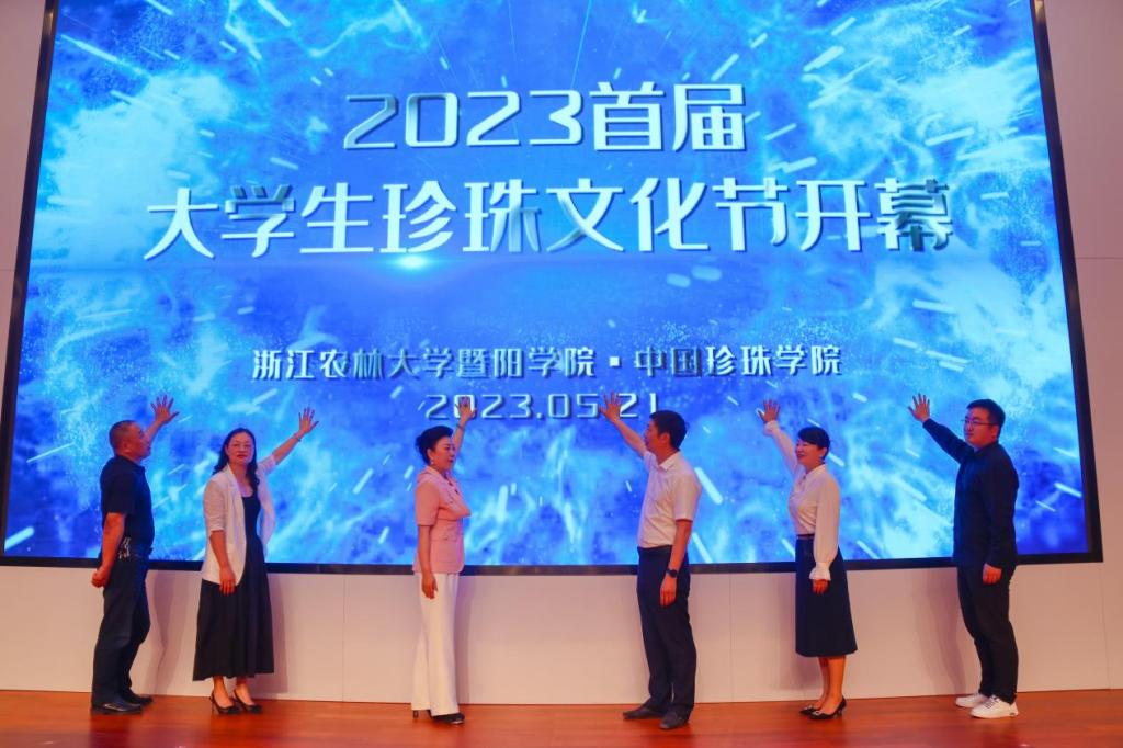 学院院长徐光辉、党委书记洪昀,浙江省珍珠行业协会会长陈夏英、中国珍珠学院常务副院长王丽、诸暨市山下湖镇副镇长楼巨峰、浙江省珍珠行业协会秘书长何铁元共同为2023首届大学生珍珠文化节开幕。