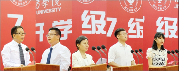 大学,是同学们学会学习,掌握专业基础知识、基础理论、基础技能,锤炼方法,砥砺人生品格的一个重要学习阶段。典礼上,石道金向新生们讲解了浙江农林大学发展概况和诸暨市市情,并从“学院注重提升同学们的专业核心竞争力”,“学院充分保障同学们的学习自主选择权”,“学院为同学们搭建了多样的创业实践平台”,“学院出台有系列奖学助学与帮扶政策”,“学院开展有特色鲜明的校园文化和学术活动”等五个方面重点为新生们介绍了校本知识。