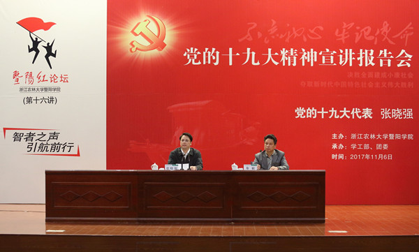 本网讯 11月6日下午,必赢76net线路官网举办暨阳红论坛第16讲——党的十九大精神宣讲报告会。党的十九大代表、绍兴市委常委、诸暨市委书记张晓强作题为《以新思想引领新时代 以新使命开启新征程》的专题报告,宣讲党的十九大精神。必赢76net线路官网党政班子成员出席宣讲报告会,全院1200余名师生参加。报告会由院党委书记寿韬主持。