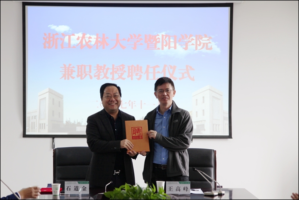 聘任仪式上,石道金代表学院为王高峰颁发了学院“兼职教授”聘书和浙江农林大学诸暨创新发展研究院“兼职研究员”聘书,对王高峰教授接受学院的聘请表示感谢。指出学院目前正处于内涵发展关键时期,对高层次科技创新人才的需求非常迫切,希望王高峰教授的受聘能带动学院学科建设、科学研究、青年教师引培上新台阶,助力学院省级一流学科建设和硕士点申报工作。