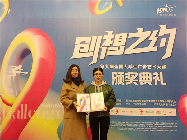 日前,第九届全国大学生广告艺术大赛颁奖典礼在全国政协礼堂举行。必赢官网广告学专业学子荣获全国三等奖1项、浙江省二等奖1项,以及全国优秀奖1项、浙江省优秀奖2项的好成绩,指导教师白文君与广告学15级学生龚一琰参加了颁奖典礼。