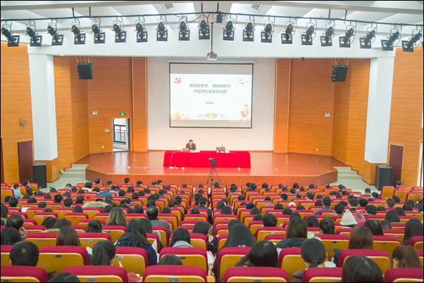 本网讯 12月15日下午,校党委委员、副校长金佩华到学院作题为《领悟新思想、拥抱新时代,开启学校发展新征程》的专题报告,从“十九大的重要成果”“十九大报告主要精神”“党章修正案重要内容”“拥抱新时代抢抓新机遇”“担当新使命 开启新征程”等五个方面宣讲党的十九大精神。报告会由院党委书记寿韬主持。