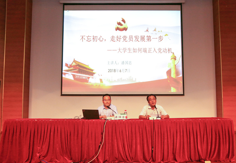 “中国共产党人的初心和使命,就是为中国人民谋幸福,为中华民族谋复兴。这个初心和使命是激励中国共产党人不断前进的根本动力。中国共产党从诞生之日起就鲜明地把马克思主义写在了自己的旗帜上,开宗明义确立了坚持马克思列宁主义的指导思想。人民立场是我们党的根本政治立场。”报告中,潘国忠重点讲授了“不忘入党初心”这个主旨。从“探寻初心——什么是正确的入党动机”“叩问初心——为什么要端正入党动机”“回归初心——怎么样端正入党动机”“坚守初心——争做新时代的合格党员”等四个维度展开报告。