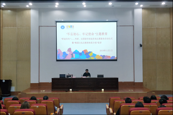 本网讯 11月1日上午,晨晓艺术与设计学院“不忘初心、牢记使命”主题教育之“研途有约”——考研、出国留学深造咨询志愿服务启动仪式在图书馆报告厅举行。韩国牧园大学国际教育院常务代表、特聘讲师李云峰受邀为学院师生作“韩国文化及教育体系介绍”的主题讲座。晨晓艺术与设计学院党总支书记、常务副院长邓剑刚主持会议,师生代表参加启动仪式,聆听了讲座。