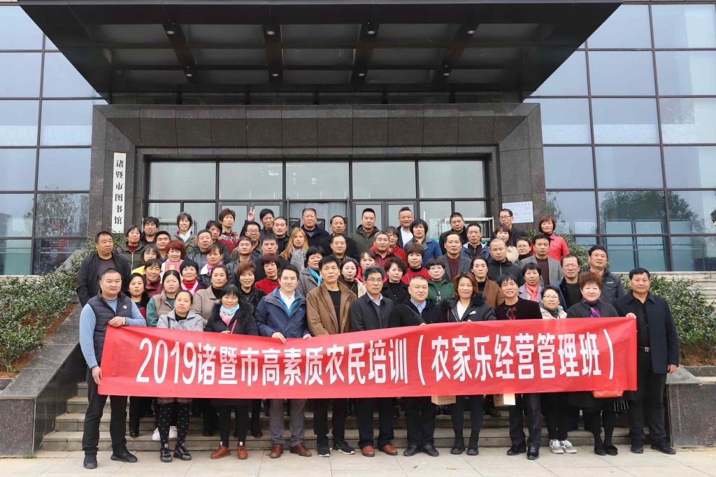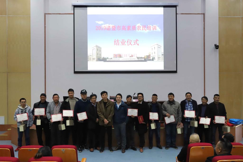 11月30日,2019年诸暨市高素质农民农家乐经营管理和植保无人机培训班在必赢76net线路官网图书馆报告厅顺利结业!市农业农村局党建室副主任谢国胜、农机管理总站副站长傅建春、陶朱商学院副院长陈稼瑜出席结业仪式,130余名学员参加结业仪式。