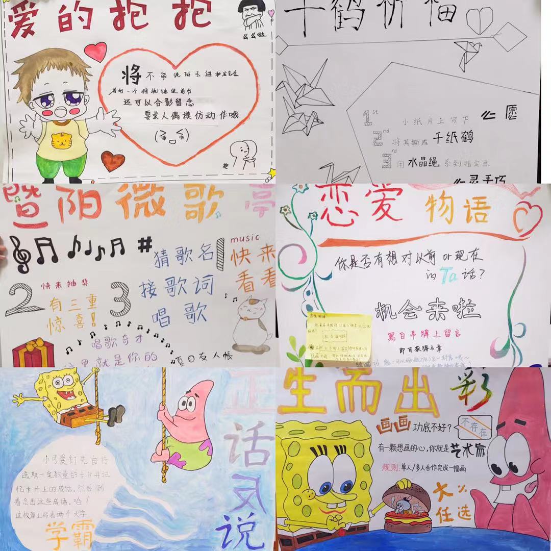 此次活动中,“熊抱”带来快乐,“千鹤”承载大家的心愿,“微歌”释放激情,“恋爱物语”诠释心意,“正话反说”帮助大脑适度运动,“生而出彩”用笔尖创造艺术,让色彩温暖人心,“无敌风火轮”带同学们刹车,漂移,风驰电掣,“运球接力”连接的是彼此的动力与活力,“俩人三足”缠住的是腿,连接的是心。