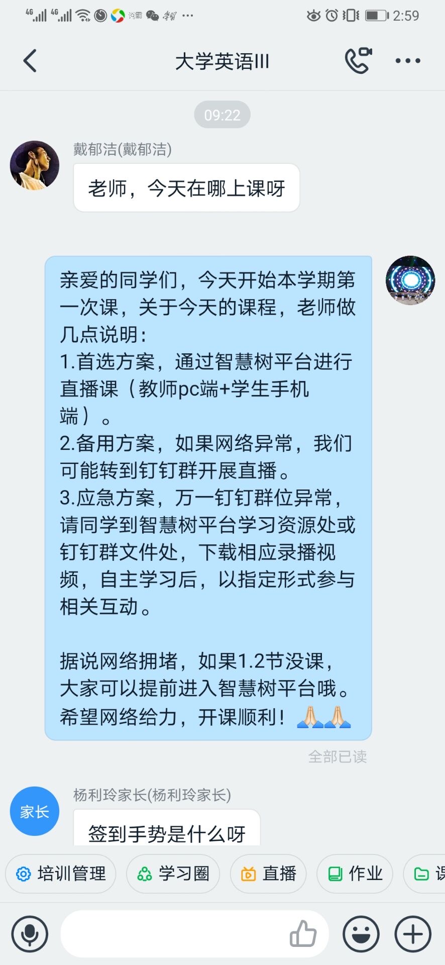 为确保在线学习与线下课堂教学质量实质等效,学院要求任课教师成立课程教学班钉钉群,通过多种途径通知学生加入课程群,争取不落下每一个学生。同时任课老师要加强在线教学的管理,学生线上出勤情况、在线测试情况、在线辅导答疑情况等相关数据应作为平时成绩的主要依据。