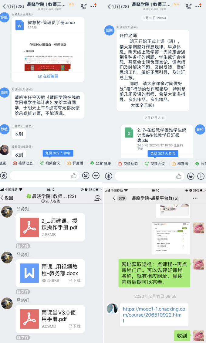 自疫情发生以来,学院在线教学领导小组在指导全体师生做好防控工作的同时,严格落实在线值班制度,全面了解教学信息,全方位推进教学工作进展:首先,制定了春季学期延期开学教学计划的调整方案,特别是针对开学后无法返校教师和不同地区学生返校特点做好相关预案;其次,掌握在线课程信息,对新学期所有课程进行摸底,逐一联系任课老师,确认授课方式和教学平台;第三,组织教师积极应对,充分做好开课前建课准备,指导教师充分利用在线平台、钉钉、微信等网络资源组织教学,探索创新“互联网+”教学模式,参加在线课程教学培训,确保教学工作顺利开展;第四,负责对学院疫情防控相关教学工作落实情况的督查,认真落实每日教学工作日汇报统计工作,及时掌握教师和学生的教学状态,联动辅导员确保不落下一个学生。