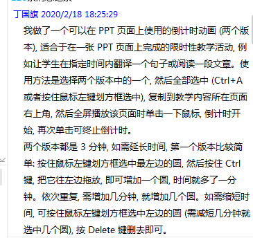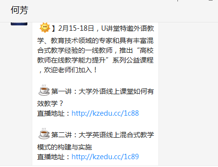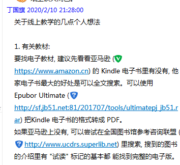 为了使在线教学更加平稳有序地开展,必赢官网丁国旗老师通过前期的摸索和实践,总结在线教学平台的经验,及时在人文学院群提供了有关在线教学的意见和建议共几十条,涉及平台选择、电子书的购买、文档的转化、软件操作要领等;何芳老师也通过网上资料的搜索,及时分享了在线教学的经验和体会。