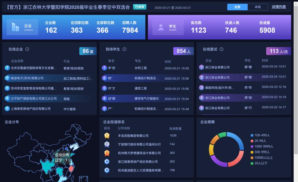 本次双选会共审核170余家单位报名参会,提供就业职位数近8000余个,共有1123 名校内外学生参与应聘,共投递简历750余份。参加当天招聘会上市公司13家,多家国有企业、合资公司、外资企业等,涉及教育培训、医药生物、经济贸易、建筑工程、IT技术和设计制造类等多个行业领域。比起传统校园线下招聘会,线上空中双选会的报名企业可以不受区域和时间限制,参会形式更灵活,同时学生目标也会更明确,与企业连接更简单快捷。
