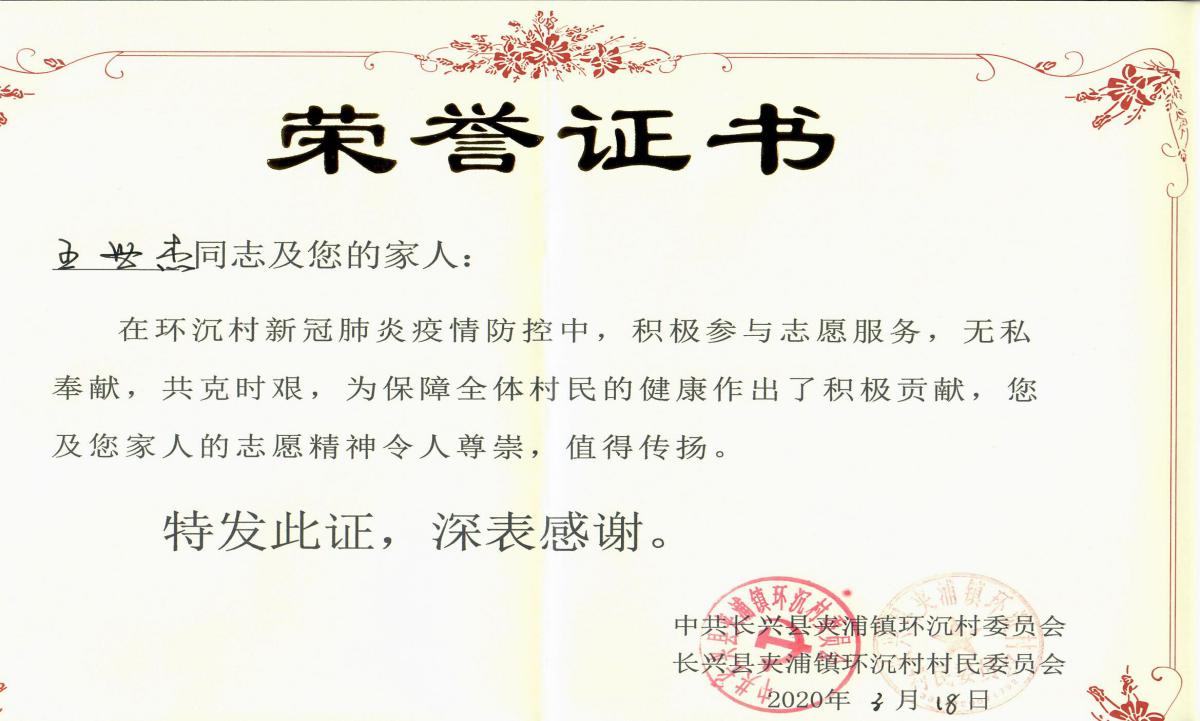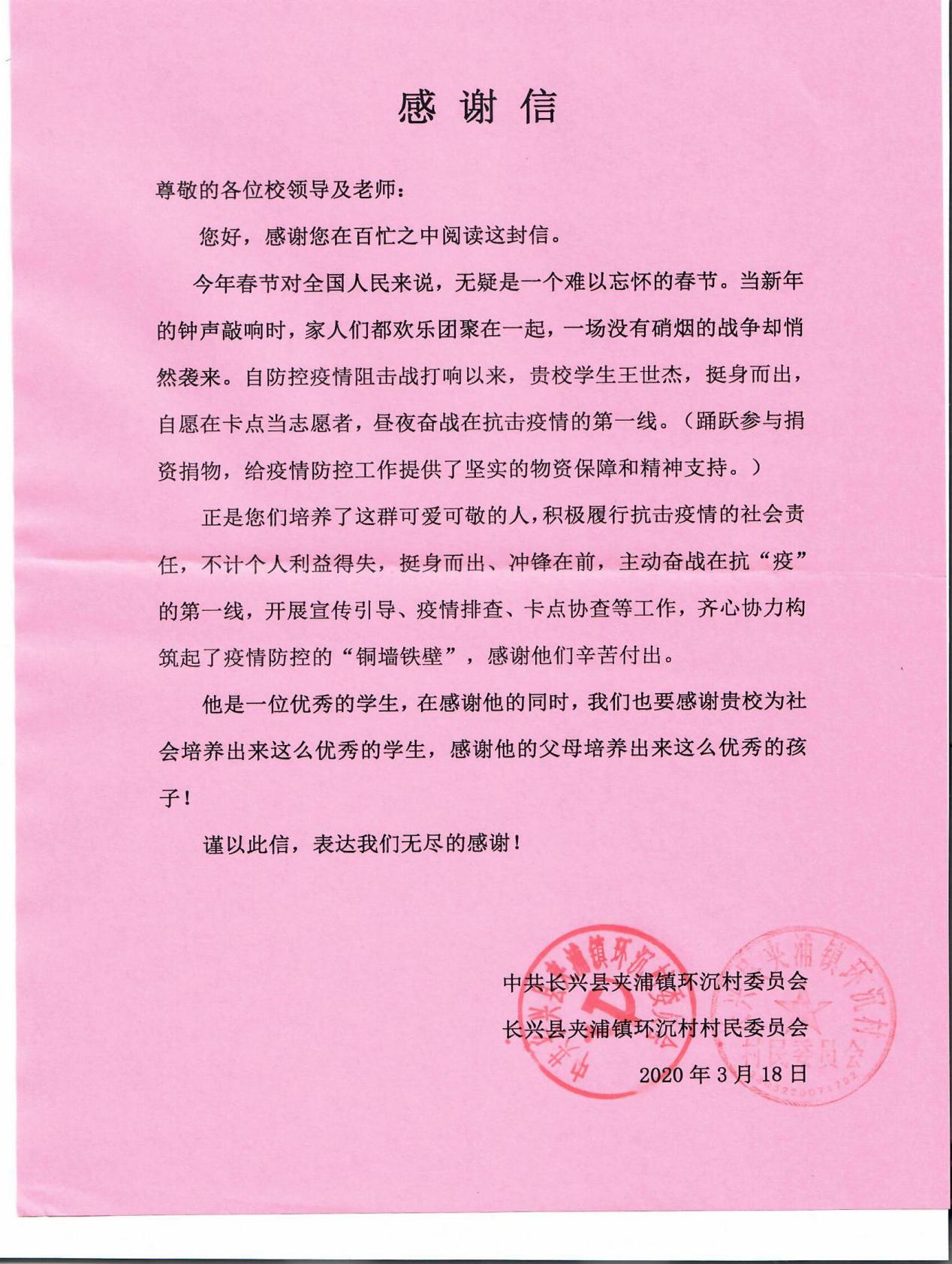 由于王世杰同学在环沉村新冠肺炎疫情防控中,积极参与志愿服务,无私奉献,共克时艰,为保障全体村民的健康作出了积极贡献,湖州市长兴县夹浦镇环沉村村委会向必赢76net线路官网致以谢意并给王世杰同学及其家人颁发了荣誉证书,以表彰王世杰同学在抗疫过程中做出的贡献。
