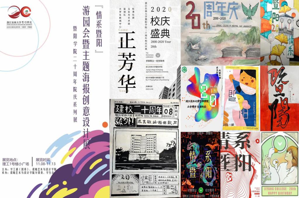 为迎接学校20周年校庆,让广大师生感受艺术的魅力,晨晓艺术与设计学院师生团队,手执画笔匠心巧思,设计了院庆主题LOGO、校庆纪念品-《暨阳之路》画册,并于11月7日—12月31日期间在理工1号楼走廊举办了院庆系列展——“秀美山下湖”工业园区壁画创意设计展、“抒”情画“艺”2020级新生作品展、“情系暨阳”主题海报创意设计展。