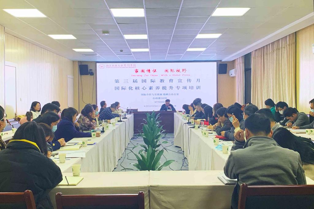 为进一步加强教师队伍建设,拓展国际化视野,提升国际交流项目知晓度、管理能力及人才培养质量,12月8日下午,学院举行国际化核心素养提升专项培训。此次培训由浙江大学国际教育学院院长、“一带一路”学院院长,浙江大学建筑工程学院建筑学系教授、博士研究生导师,中国建筑学会建筑师分会技术专业委员会副主任委员沈杰作“国际化视野和人才培养”专题讲座,学院国际合作与交流部副主任宣璐作学院国际交流项目介绍。学院党委副书记高国俊,国际合作与交流部、各二级学院国际化负责人及教学秘书、全体辅导员参加了本次培训。培训由副院长袁志刚主持。