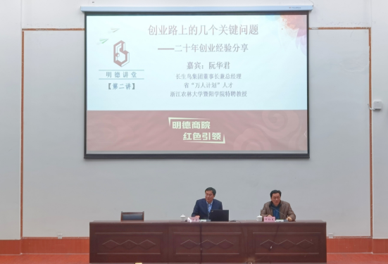“明德讲堂”是商学院“明德商院红色引领1+1”党建工作品牌系列子活动之一,旨在通过高水平的专家讲座来提升商院师生理论武装,实现思想引领。12月24日下午,商学院在图书馆报告厅举办了明德讲堂(第二讲)《创业路上的几个关键问题——二十年创业经验分享》。此讲邀请了复旦大学经济学博士,高级经济师、正高级工程师,长生鸟董事长兼总经理,国家级人才,全国工商联美容化妆品业商会副会长、诸暨珍珠业省级科技创新服务中心主任、绍兴复旦大学校友会常务副会长、浙江大学创业导师、必赢76net线路官网特聘教授阮华君作为主讲嘉宾。讲座由商学院院长何红光主持,商学院近200名师生参加了本次活动。