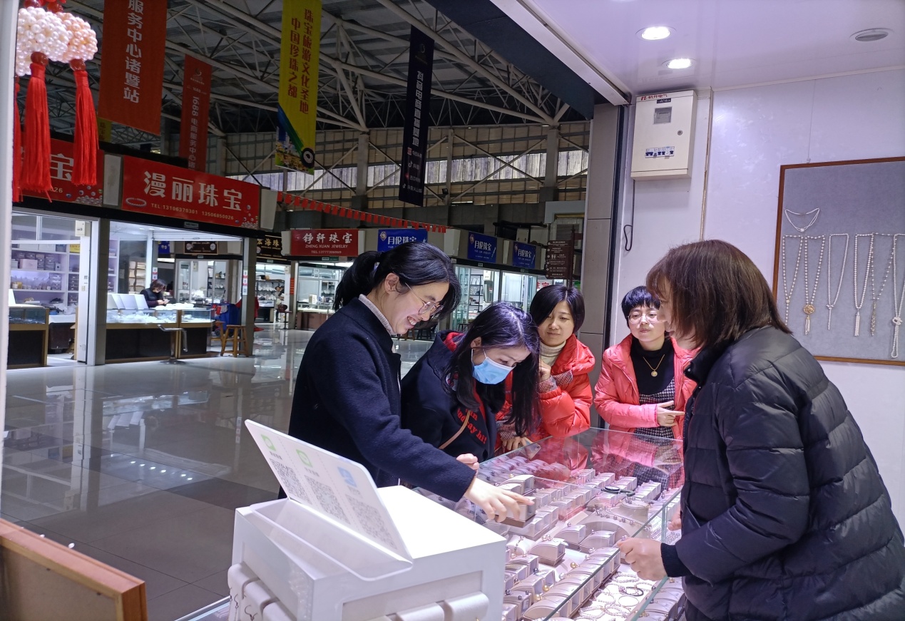 然后,来到山下湖华东珠宝城参观考察珍珠原材料、加工及成品销售市场情况。