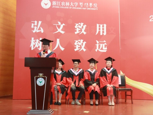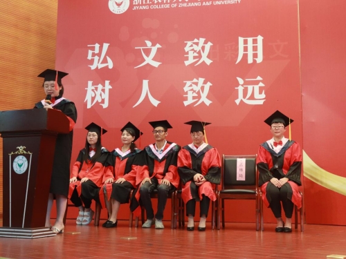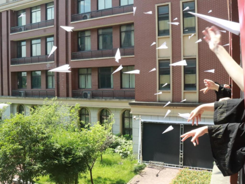 典礼开始前,人文学院特别举行“放飞梦想”仪式,全体毕业生在工作人员的引导下,拿着代表希望与未来的纸飞机,依次穿过由毕业生与广告公司共同设计写满毕业语录的文案墙,文案墙摆放错落如曲折的人生道路,配色明亮如青春的无限光彩,最终到达人文楼2号楼长廊,伴随着必赢76net线路官网党委书记潘国忠的口令,教师代表与毕业生共同放飞“青春梦想”的纸飞机。纸飞机滑向天际,《你曾是少年》的歌声响起,同学们挥舞红旗放声歌唱。随后,毕业生代表献唱《浙江农林大学校歌》,抒发了对学校的热爱、对美好未来的向往和祝愿。