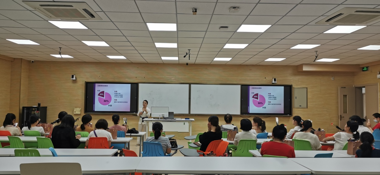 王正虹老师从皮肤的生理结构、肤质的分类、皮肤常见问题及解决方案等方面给老师们进行了讲解,并对老师们提出的皮肤保养过程中遇到的各种问题进行了一一解答。
