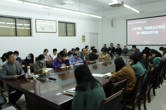 11月11日下午,人文学院、马克思主义学院在人文3502会议室召开本学期第十周政治学习会。人文学院副院长孟琳琦、党总支副书记石杭科及全体教职工参加会议。会议由党总支副书记石杭科主持。
