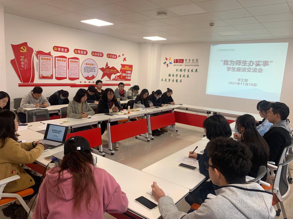 为进一步深化党史学习教育,推进“我为师生办实事”实践活动深入开展,更好地搭建学院与学生沟通的平台,提升学院育人工作能力和水平,11月18日,学工部举办“我为师生办实事”学生座谈交流会。学工部负责人,学生社区生活指导员与学生代表面对面交流。