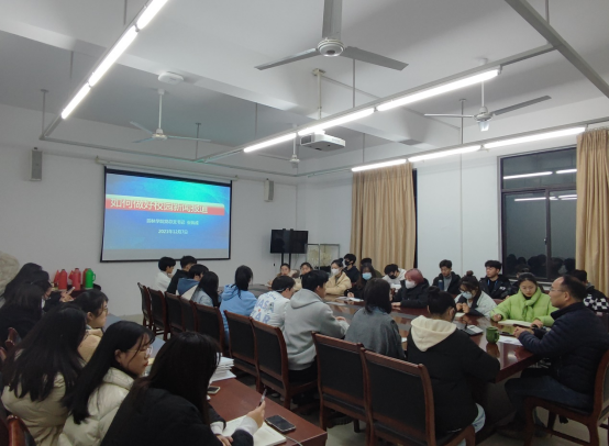 为进一步加强宣传思想队伍建设,提高党团学生骨干融媒体新闻采编技术和能力,拓宽新时代新媒体工作队伍视野,提升新闻写作、编辑能力和水平,12月7日晚,园林学院在理工3-302会议室举办【红绿讲坛(第四讲)】。讲座由团学指导老师张婧蕾主持,园林学院党总支书记张佩成就如何做好校园新闻报道向部分党、团学生骨干作了具体指导和培训。