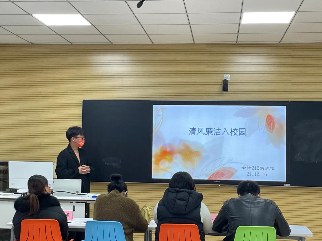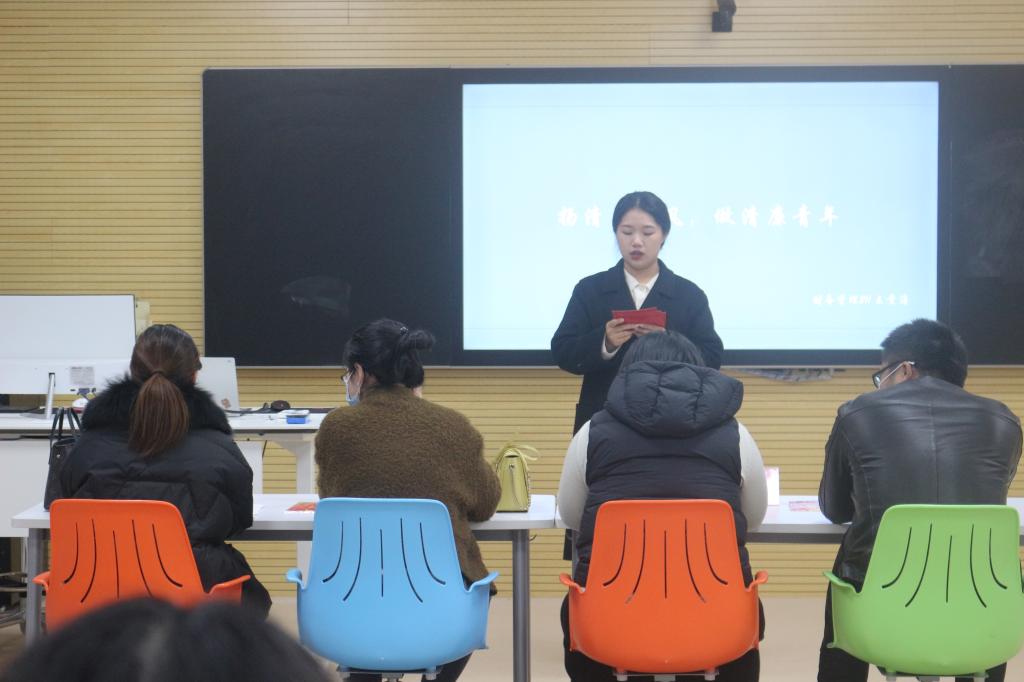 为进一步弘扬清廉风气,推进清正廉洁教育深入人心,12月16日下午15:30,商学院在理工1507教室举办了以“清风沐校园,廉洁伴我行”为主题的演讲比赛,旨在引导广大青年学生树立正确的荣辱观,争做反腐倡廉的生力军。根据疫情防控需要,比赛不组织观众现场观摩,同时赛事组织方对参赛选手、工作人员进行严格的现场测温、验码、行程筛查,在场人员全程佩戴口罩。商学院党总支书记潘小承、商学院党总支副书记兼学工办主任徐定高以及各学生党支部书记出席本次活动。