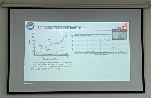 芳基硼酸/羧酸是低毒、廉价以及来源广泛的精细化工原料和合成中间体,是构建C-C键以及C-杂键的重要反应底物。蔡琥教授从电催化芳基硼酸脱硼官能团化和电催化芳基羧酸的酰基磷酸化两个方面,向与会师生简要介绍通过脱硫卤化、氰基化、硫氰基化、酰基磷酸化等手段,以一种简单、绿色的有机合成方式,来实现这类化合物的高效、高选择性转化,从而使其能广泛应用于药物化学、材料化学和生命科学等诸多领域。
