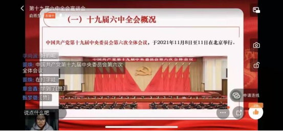 为深入学习贯彻党的十九届六中全会精神,引导全院团员青年把思想和行动统一到全会精神上来,12月19日——12月25日,“我们阳光的声音”理论宣讲团在院团委的精心指导部署下,有序在团学组织、各二级学院开展党的十九届六中全会精神宣讲。由于疫情原因,本轮宣讲均采用钉钉线上宣讲的形式。