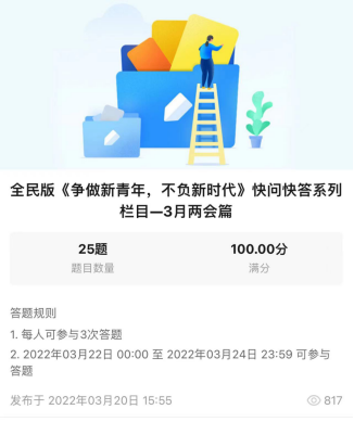 同时党员之家将两会精神纳入网络学堂内容,推出快问快答系列栏目,在线进行学习和测试,以党支部和团支部成员检验阶段性的学习成效。