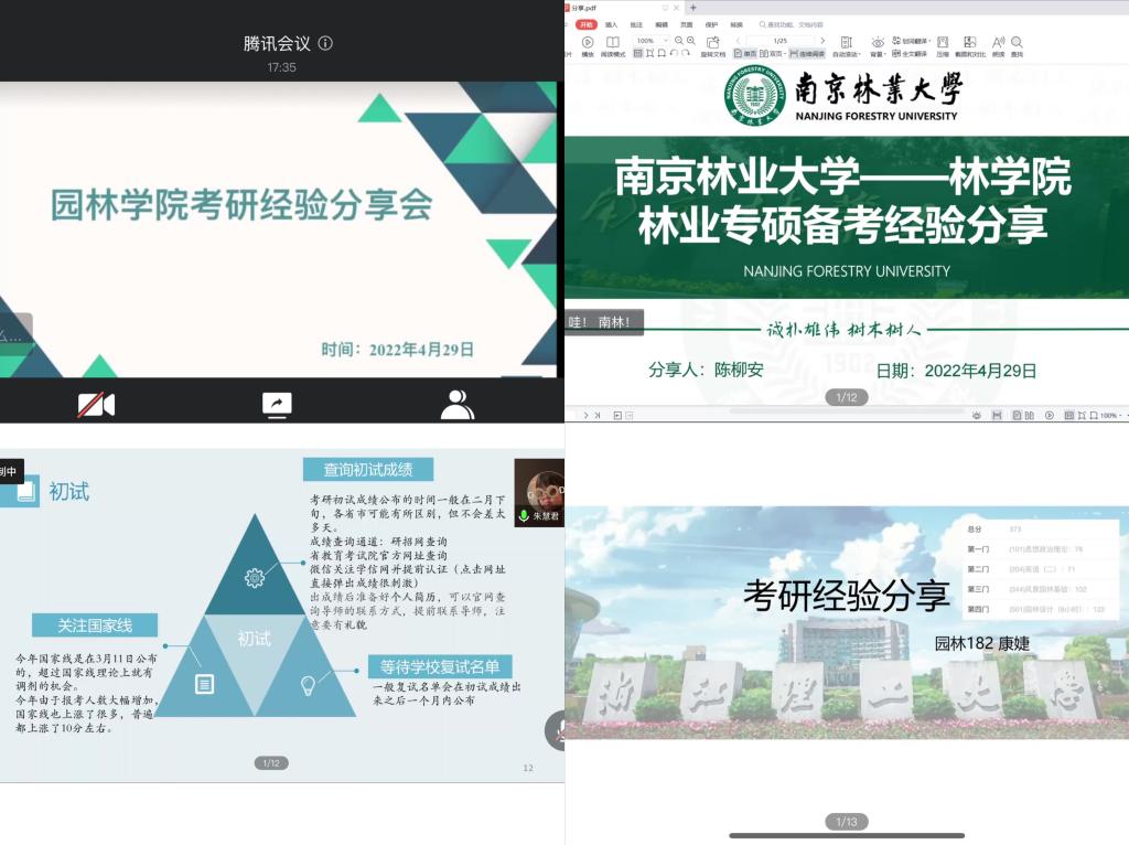 为加强“尚贤耕读”学风建设,帮助考研学子进一步端正考研心态、认清考研形势、掌握应试技巧,4月29日晚,园林学院考研经验交流分享会通过腾讯会议的形式顺利举行,7位今年成功上岸的学长学姐主讲,园林学院党总支副书记、辅导员及考研学生参加。