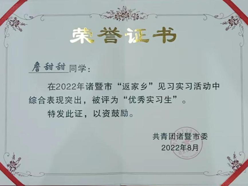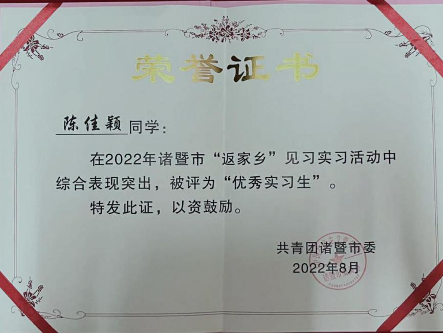 必赢官网学子在共青团诸暨市委2022大学生“返家乡”见习实习中喜获“优秀实习生”