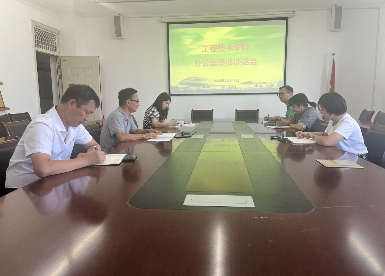 9月19日下午,工程技术学院在理工3402会议室召开学院办公室人员集体谈话会,院长彭樟林、党总支书记周聪、副院长胡建华出席会议学院班子成员出席会议、办公室全体人员参加会议。会议由院长彭樟林主持。