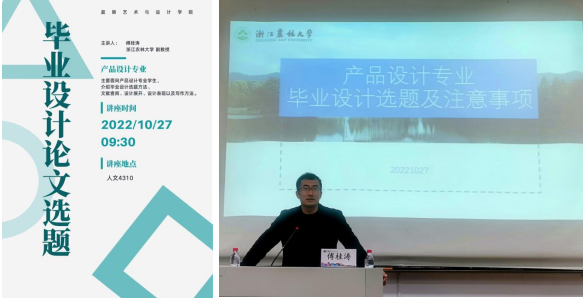 浙江农林大学工业设计系主任傅桂涛副教授从毕业设计的意义、选题、文献回顾、研究设计、调研、确定设计方向、设计进程、设计呈现、报告撰写等多方面进行细致深入地讲解,图文并茂,并向学生指出毕业设计对今后工作的重要意义,对同学们提出具体的要求,要求大家按照时间要求,保质保量地完成毕业设计论文。