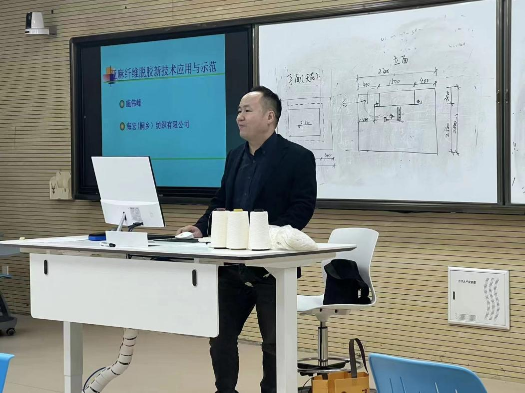 11月22日下午,海宏(桐乡)纺织有限公司总工程师施伟峰受邀来工程技术学院做了题为“亚麻纤维脱胶新技术应用与示范”的专题学术讲座,工程技术学院相关教师和学生参加讲座。