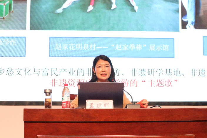 孟琼晖以激活非遗的活力价值为主题,向参加论坛的同学老师们介绍了诸暨市现存及正在发展的非遗项目。孟琼晖从以下三方面出发,挖掘非遗资源:一是诸暨人民的生活实践,看非遗蕴含的精神追求。诸暨市所体现出来的西施精神、儒学教化、佛教兴盛、文化传承、崇文尚武其中蕴含了非遗的精神追求,同时也孕育了非遗文化。二是生态宜居的美好家园,看非遗蕴含的创造力。重点打造一批乡愁文化与富民产业的非遗工坊、非遗研学基地、非遗记忆馆等公共空间,使非遗资源成为研学游的“主题歌”,多元融合培育非遗人才,以数字资源赋能,探索传承新模式。三是物质富裕的发展动力,看非遗蕴含的商业价值。提出项目研究是转化利用非遗资源的基础、传承发展是转化利用非遗资源的目的,打造手艺下、舌尖上、耳畔旁的非遗产业,结合诸暨地域特点。
