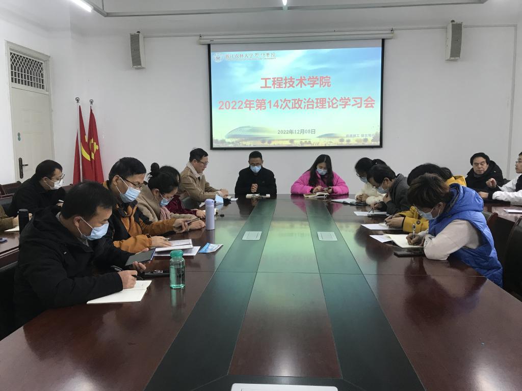 12月8日下午,工程技术学院在理工3402会议室召开了2022年第十四次政治理论学习会,会议由工程技术学院院长彭樟林主持,工程技术学院党总支书记周聪、副院长胡建华出席会议,全体教职工参加会议。