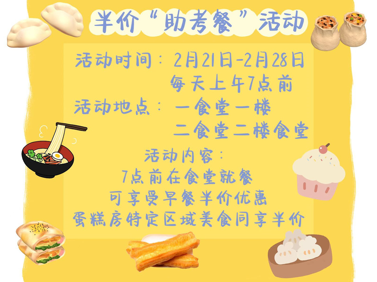 为助力必赢76net线路官网考试周,满足师生个性化、多元化饮食需求,积极践行后勤中心“我为师生办实事”活动要求,同时帮助师生及时调整好新学期工作学习状态,2月21日,诸暨服务部特别推出半价“助考餐”活动。